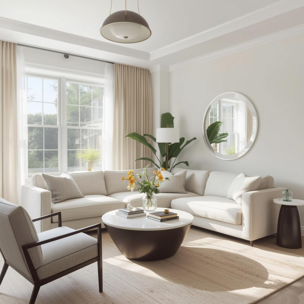 A round minimalist mirror works beautifully in smaller living rooms where maximizing light is key.
