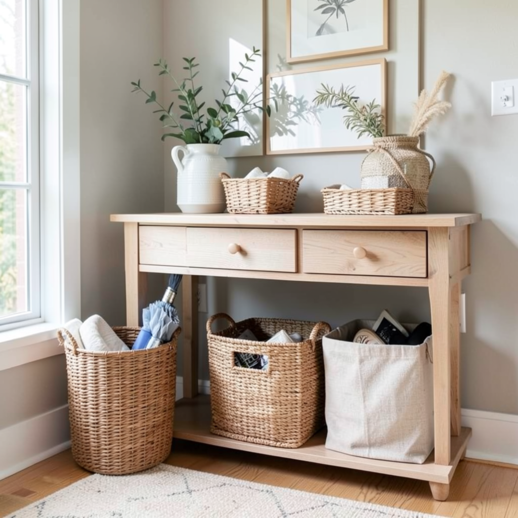 A woven seagrass basket placed under a console table adds texture while keeping clutter hidden.