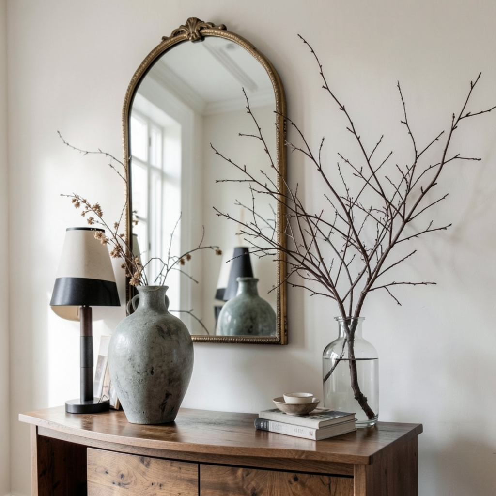 A balanced console table usually includes a mirror or artwork, a vase with greenery or flowers, and one functional object like a tray or bowl. Keeping the arrangement minimal helps the space feel calm and modern.