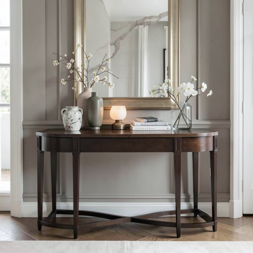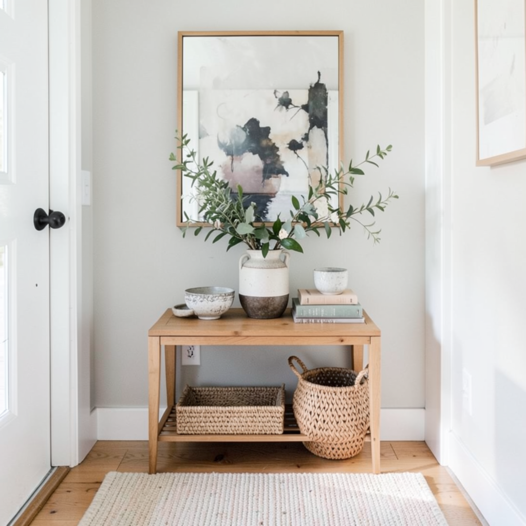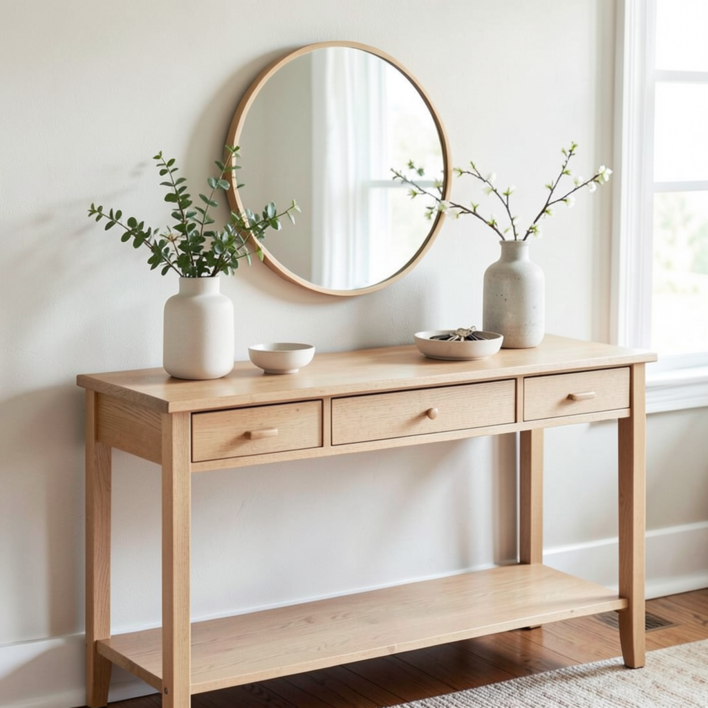 A light wood or oak console table works especially well because it reflects light and adds warmth without heaviness.