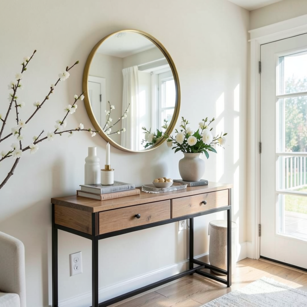 The goal isn’t to overcrowd the area with seasonal items. Instead, a few intentional updates—fresh greenery, light textures, and reflective surfaces—can instantly transform the atmosphere. These spring decor ideas help create an entry that feels elevated, functional, and effortlessly beautiful.