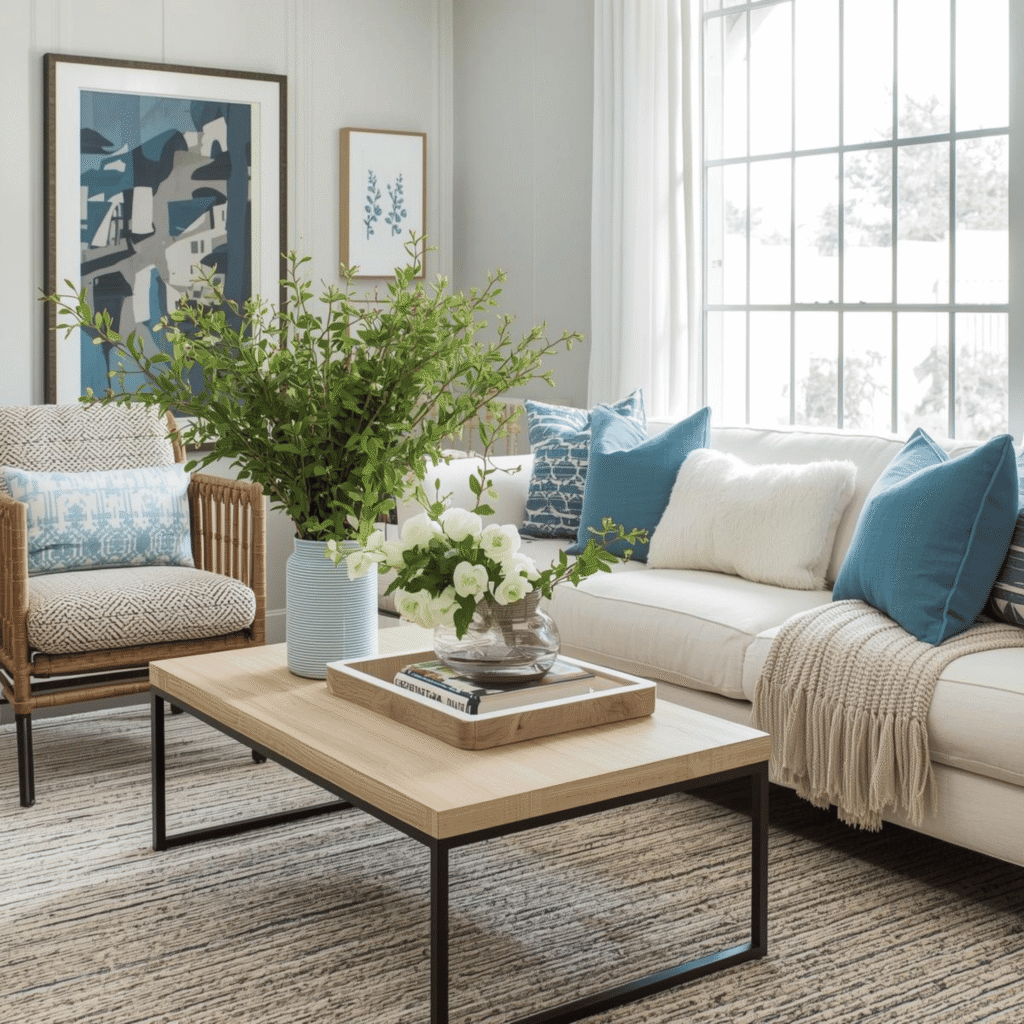 Coffee tables are one of the easiest places to introduce seasonal styling. A few simple elements like fresh flowers, decorative trays, and stacked books can instantly make a living room feel refreshed for spring. For a complete step-by-step styling formula, explore these Spring Coffee Table Decor Ideas (Simple Styling Formula) where you’ll discover easy ways to create balanced spring coffee table centerpieces and arrangements.